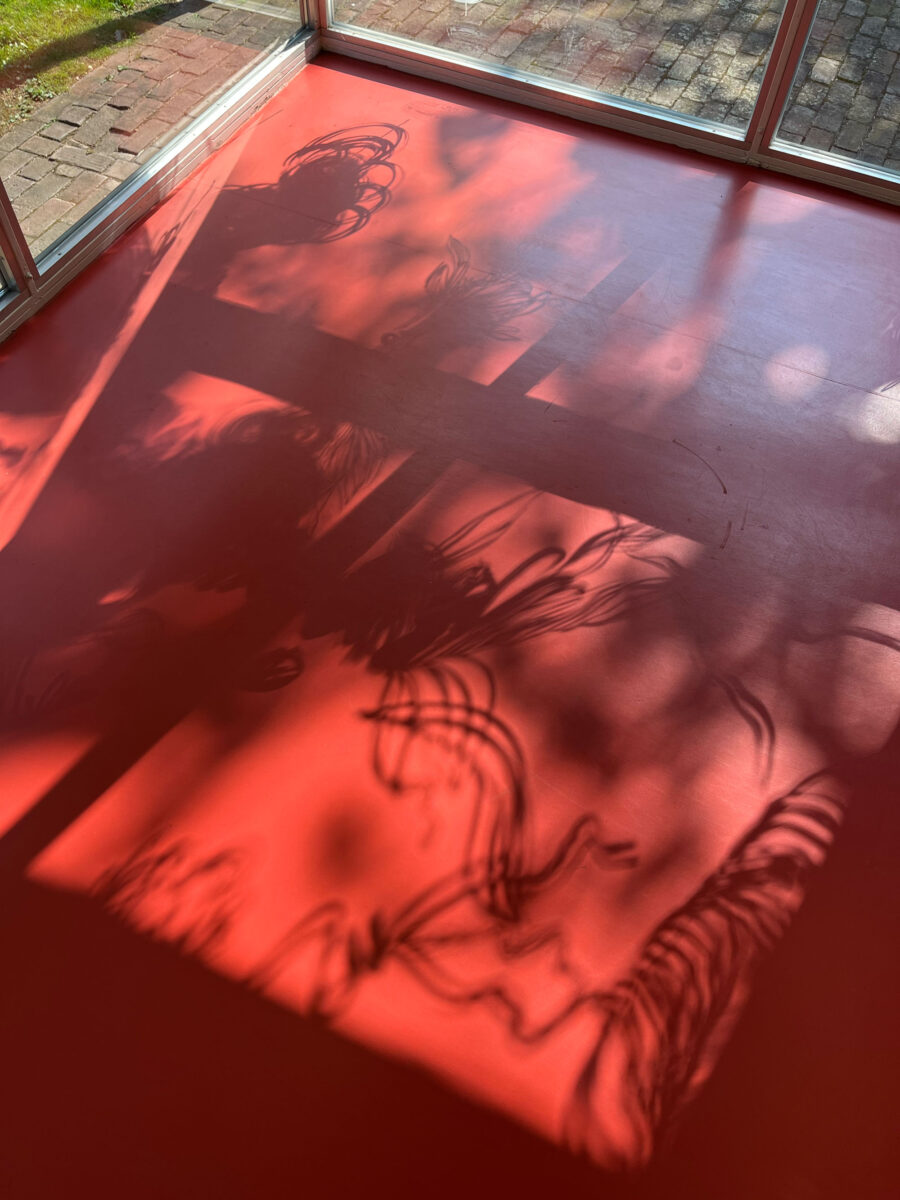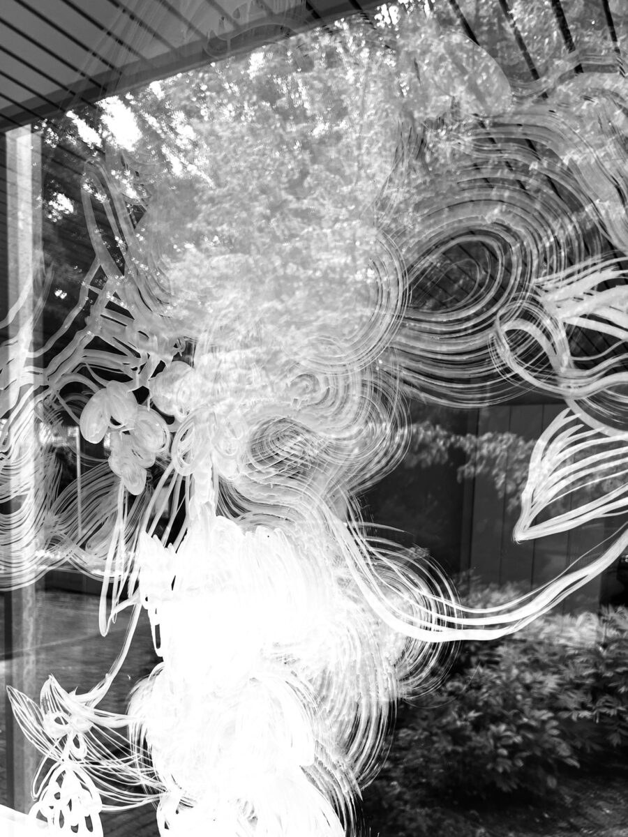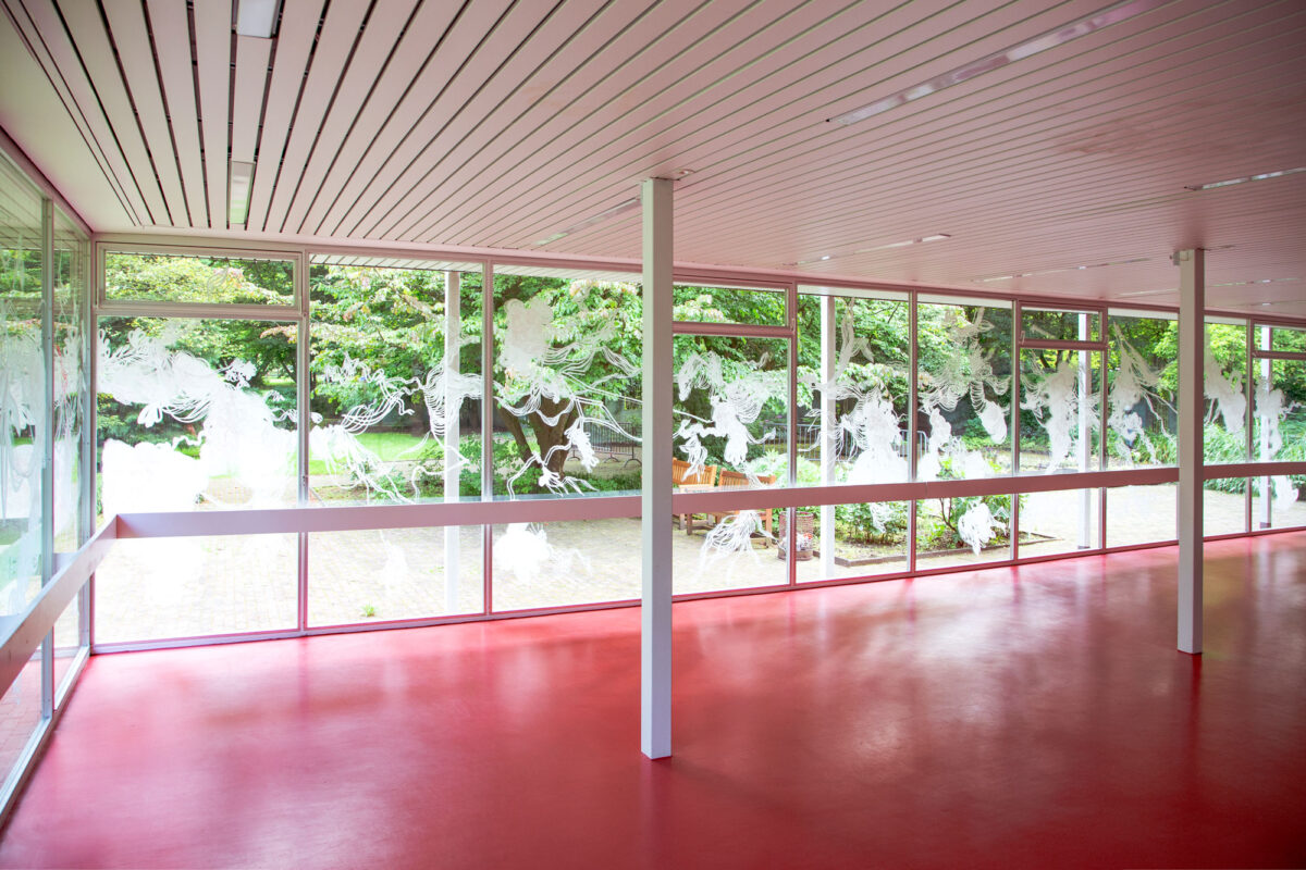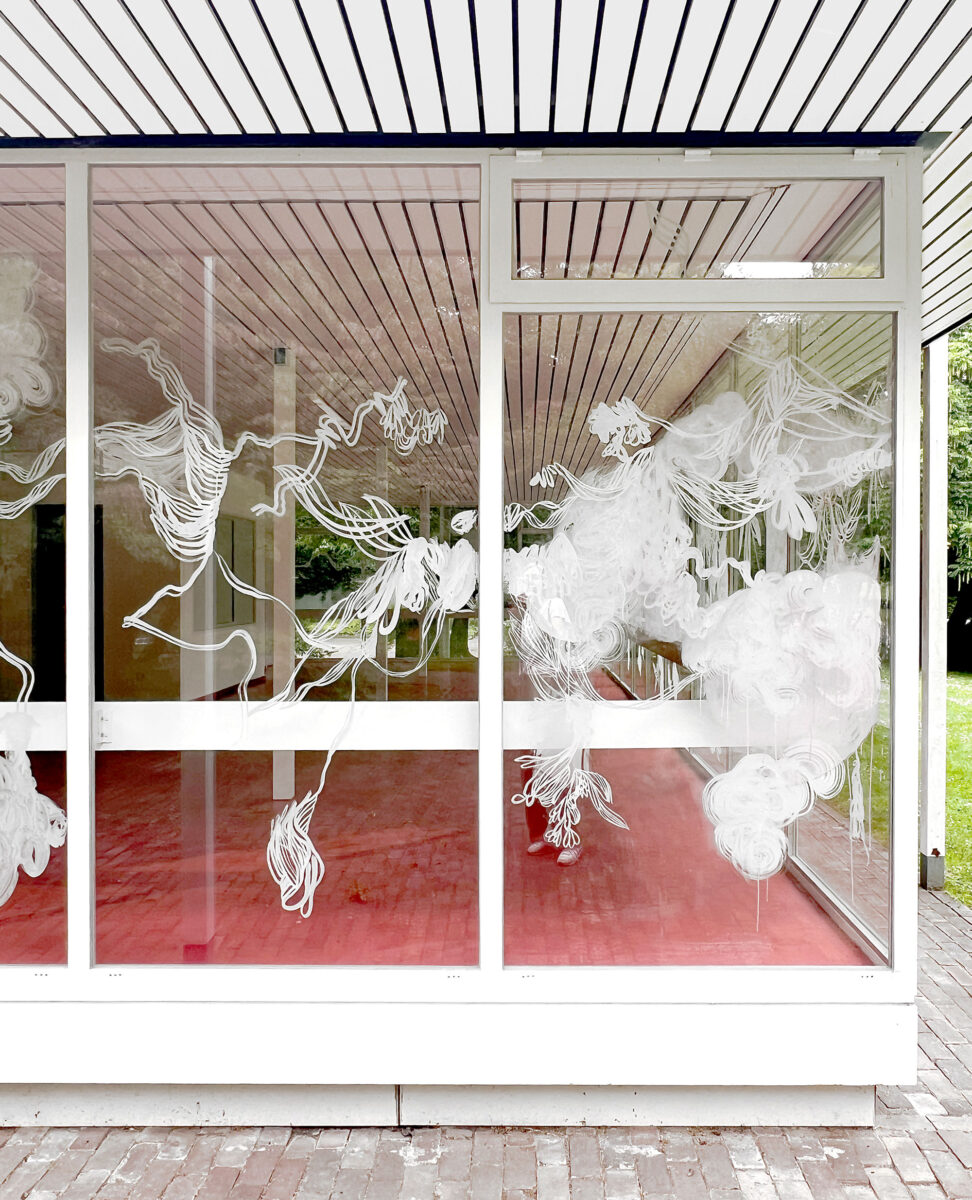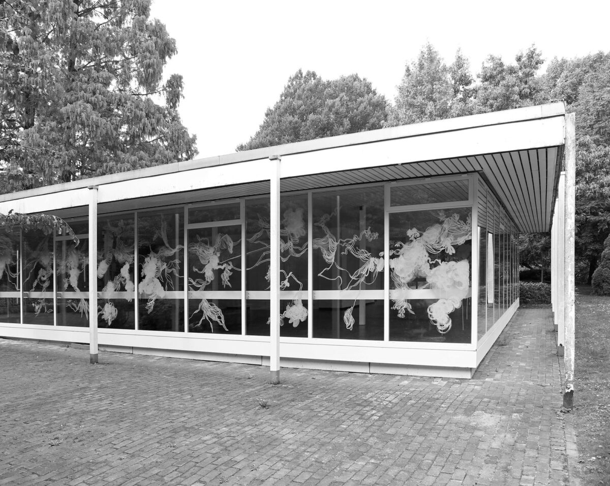 Die Installation Speculative Growth zeigt eine sich ausdehnende Zeichnung auf den Glasflächen. Durch den sich verändernden Lichteinfall entstehen unterschiedliche Schatten und Transparenzen.